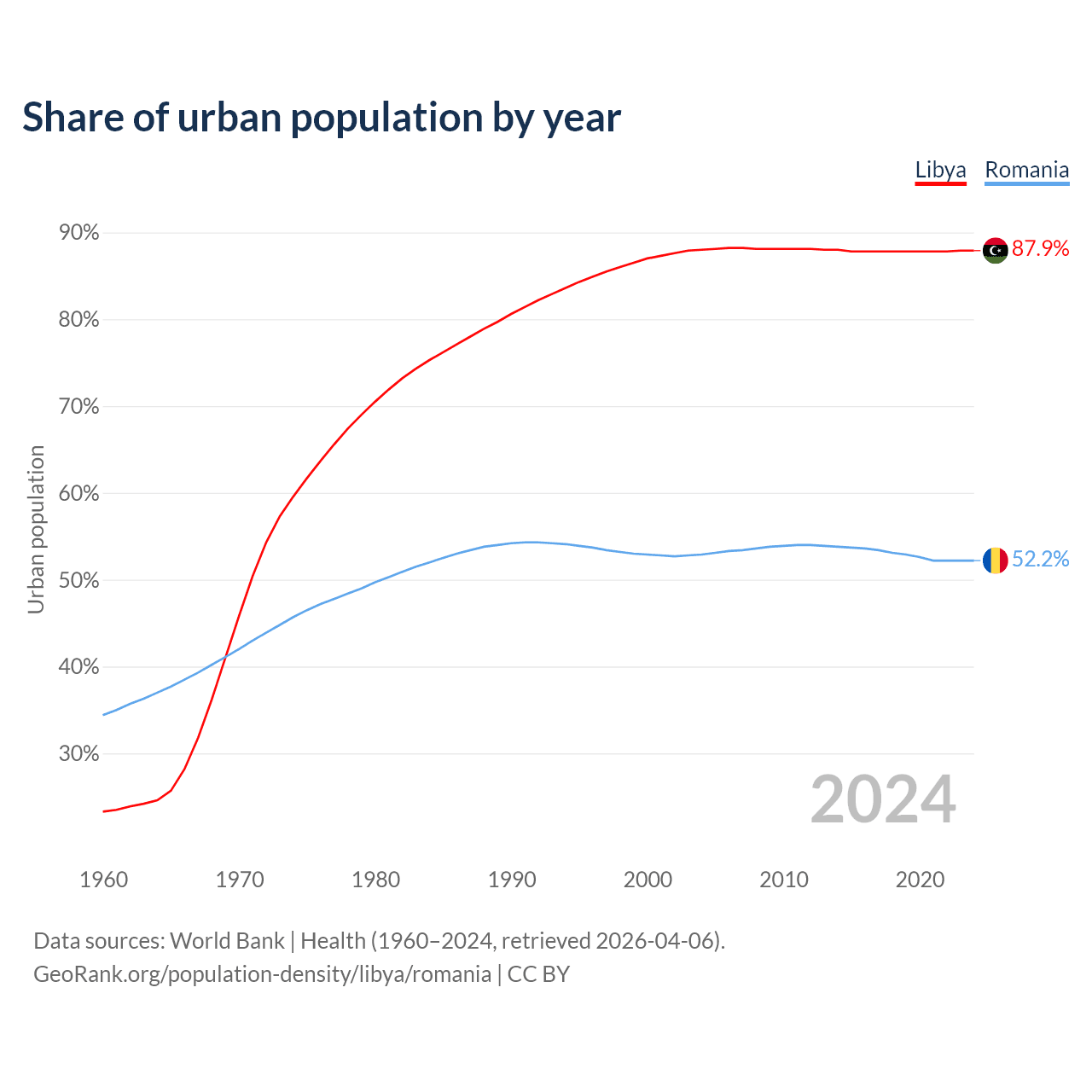 From 2004 to 2024, the share of urban population changed from 88% to 87.9% in Libya and from 52.9% to 52.2% in Romania.