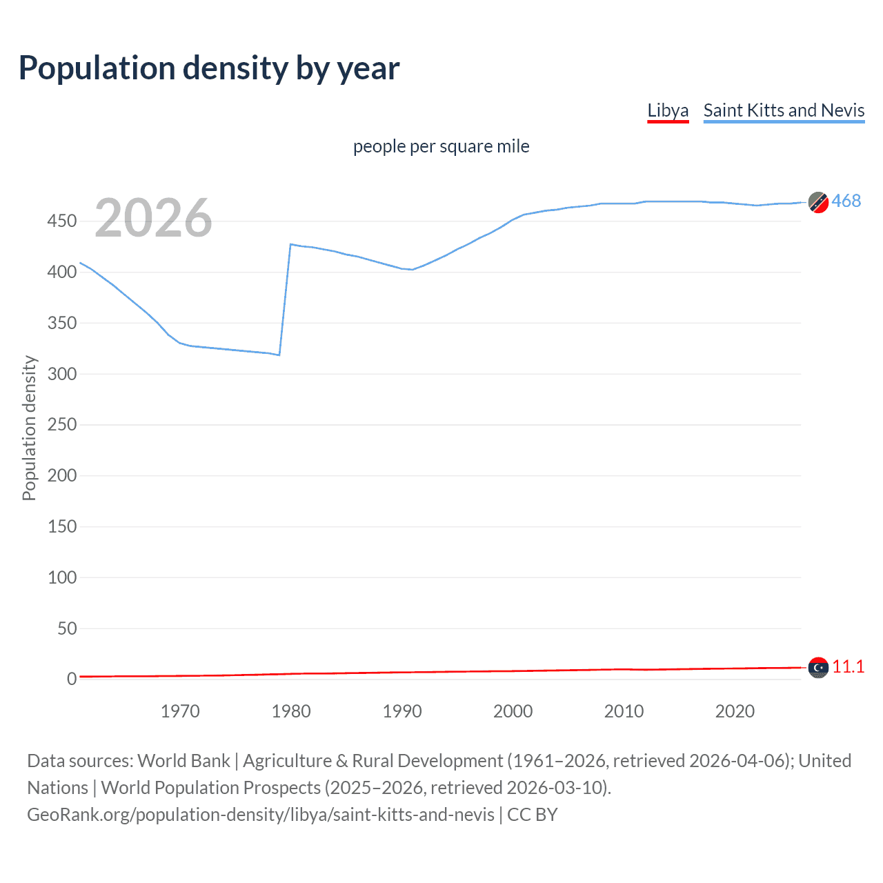 From 2006 to 2026, population density in Libya increased by 26%, compared to a 0.93% growth in Saint Kitts and Nevis.
