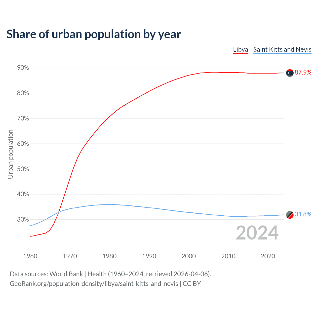 From 2004 to 2024, the share of urban population changed from 88% to 87.9% in Libya and from 32.1% to 31.8% in Saint Kitts and Nevis.