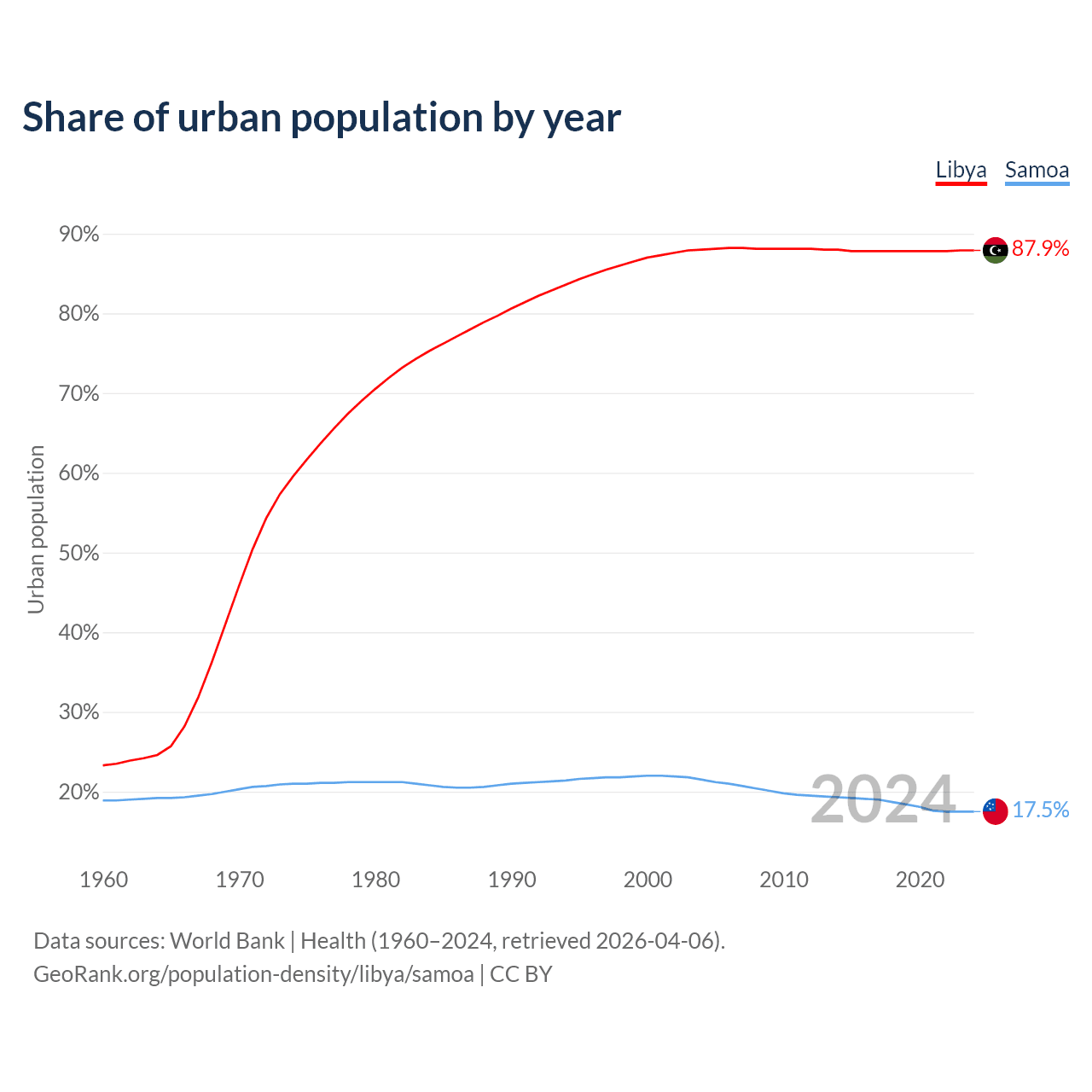 From 2004 to 2024, the share of urban population changed from 88% to 87.9% in Libya and from 21.5% to 17.5% in Samoa.
