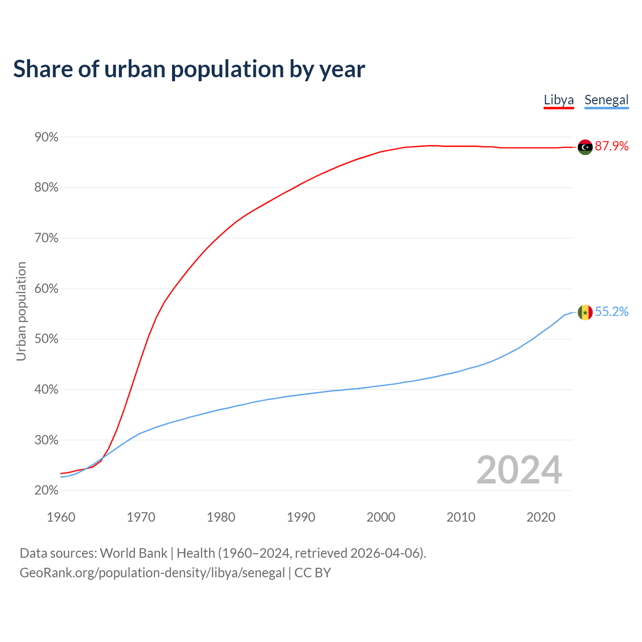 From 2004 to 2024, the share of urban population changed from 88% to 87.9% in Libya and from 41.6% to 55.2% in Senegal.