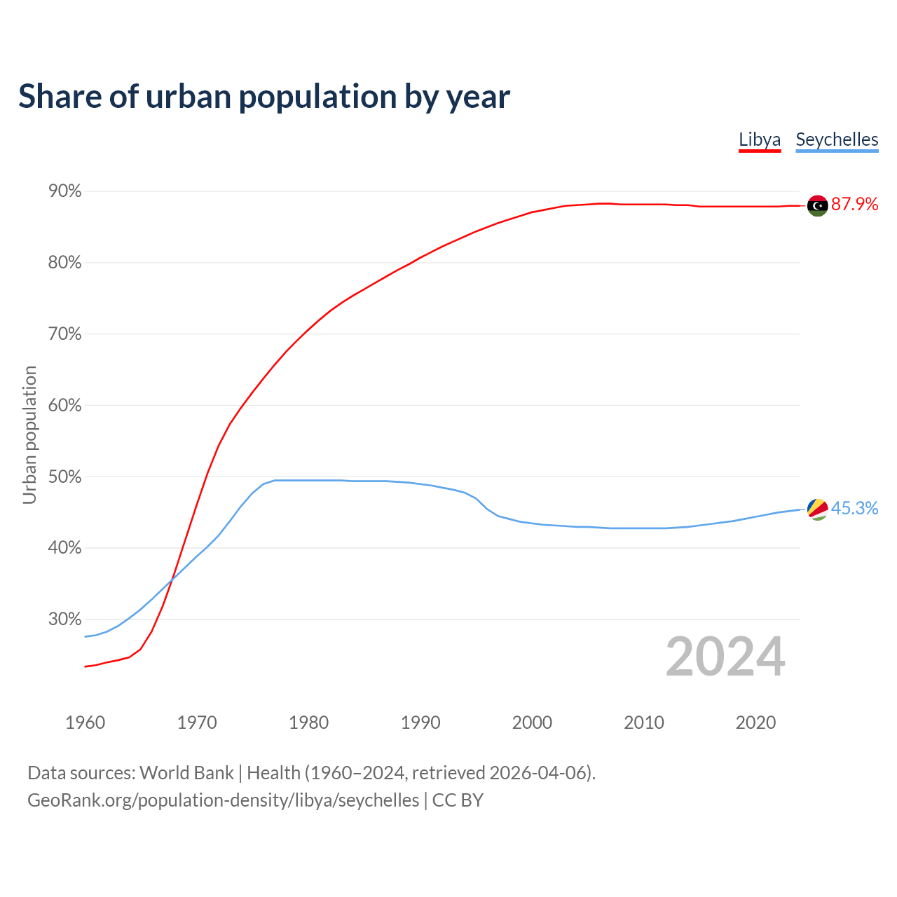 From 2004 to 2024, the share of urban population changed from 88% to 87.9% in Libya and from 42.9% to 45.3% in the Seychelles.