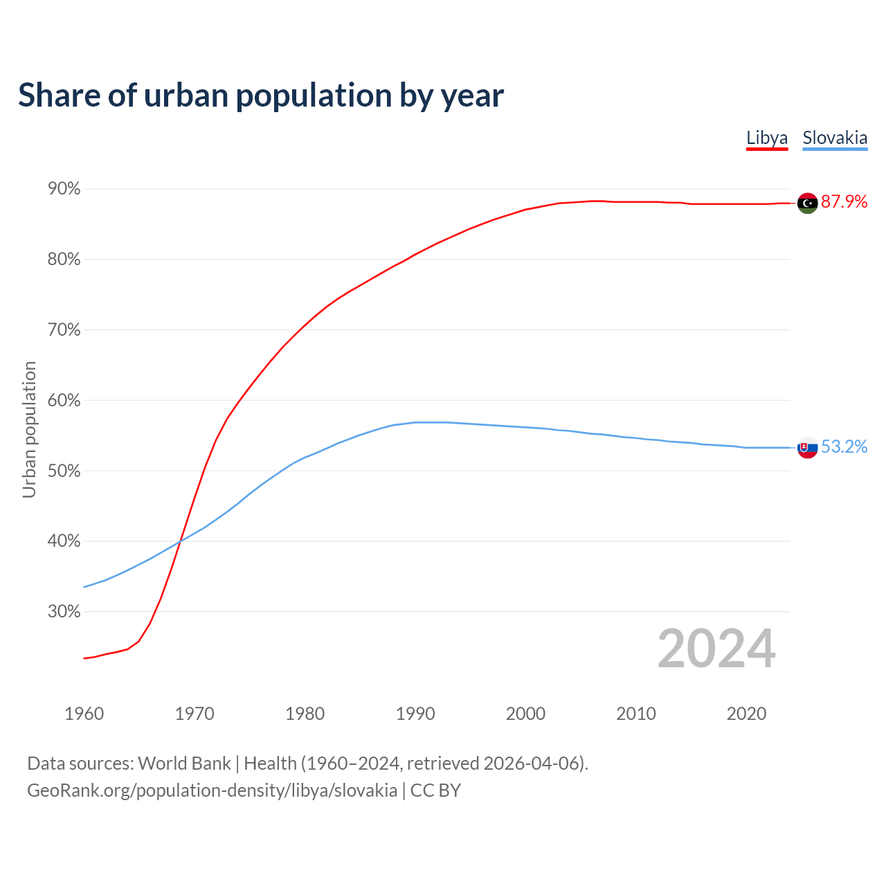 From 2004 to 2024, the share of urban population changed from 88% to 87.9% in Libya and from 55.6% to 53.2% in Slovakia.