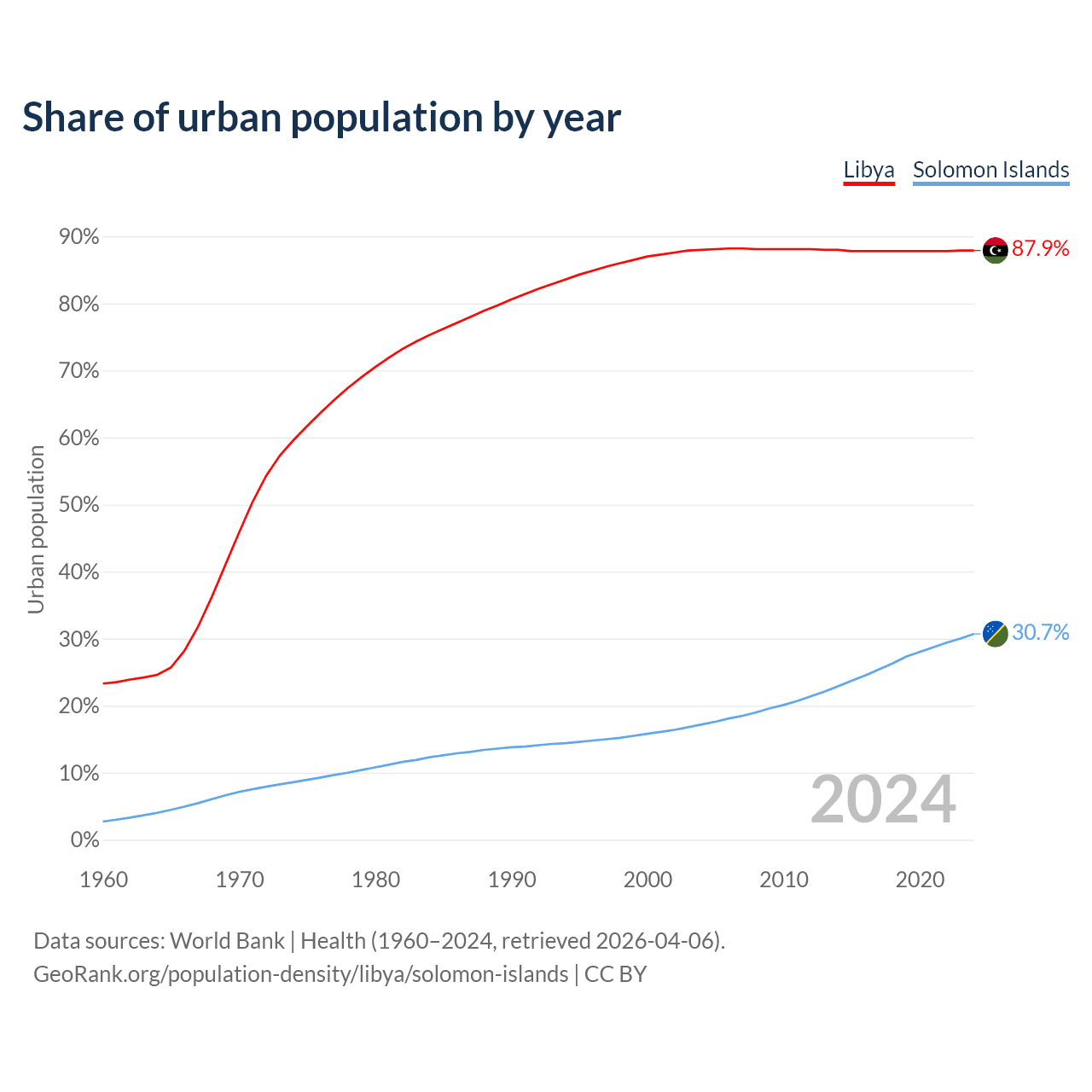 From 2004 to 2024, the share of urban population changed from 88% to 87.9% in Libya and from 17.2% to 30.7% in the Solomon Islands.