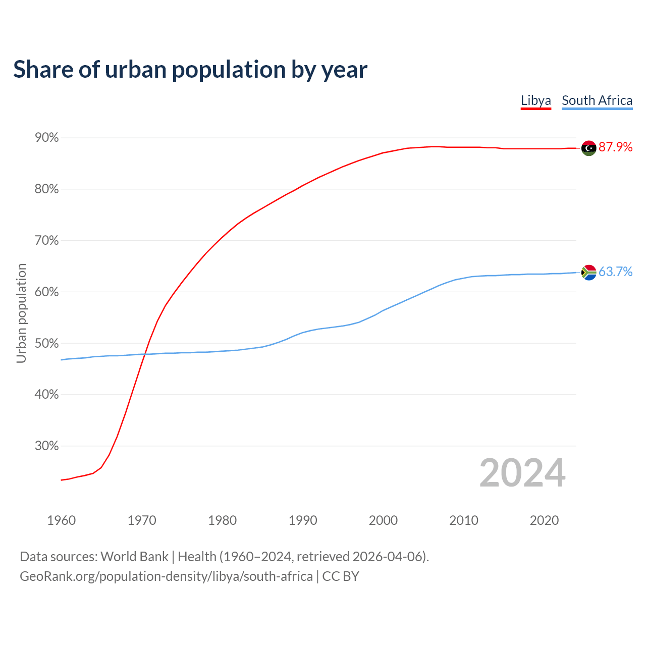 From 2004 to 2024, the share of urban population changed from 88% to 87.9% in Libya and from 59.1% to 63.7% in South Africa.