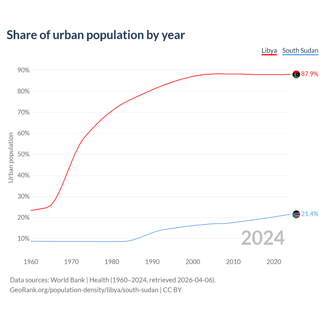 From 2004 to 2024, the share of urban population changed from 88% to 87.9% in Libya and from 16.8% to 21.4% in South Sudan.