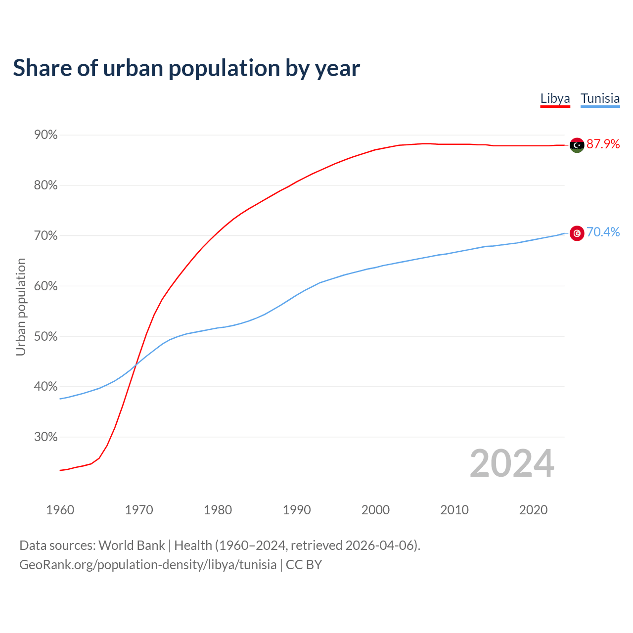 From 2004 to 2024, the share of urban population changed from 88% to 87.9% in Libya and from 64.9% to 70.4% in Tunisia.