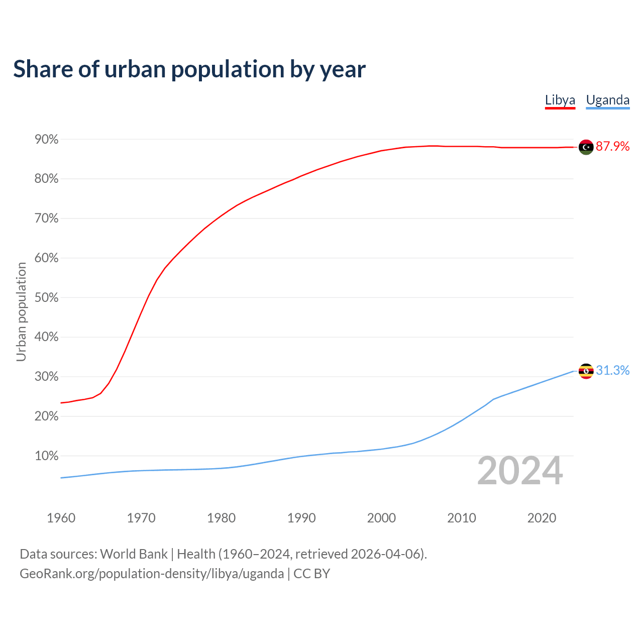 From 2004 to 2024, the share of urban population changed from 88% to 87.9% in Libya and from 13.1% to 31.3% in Uganda.