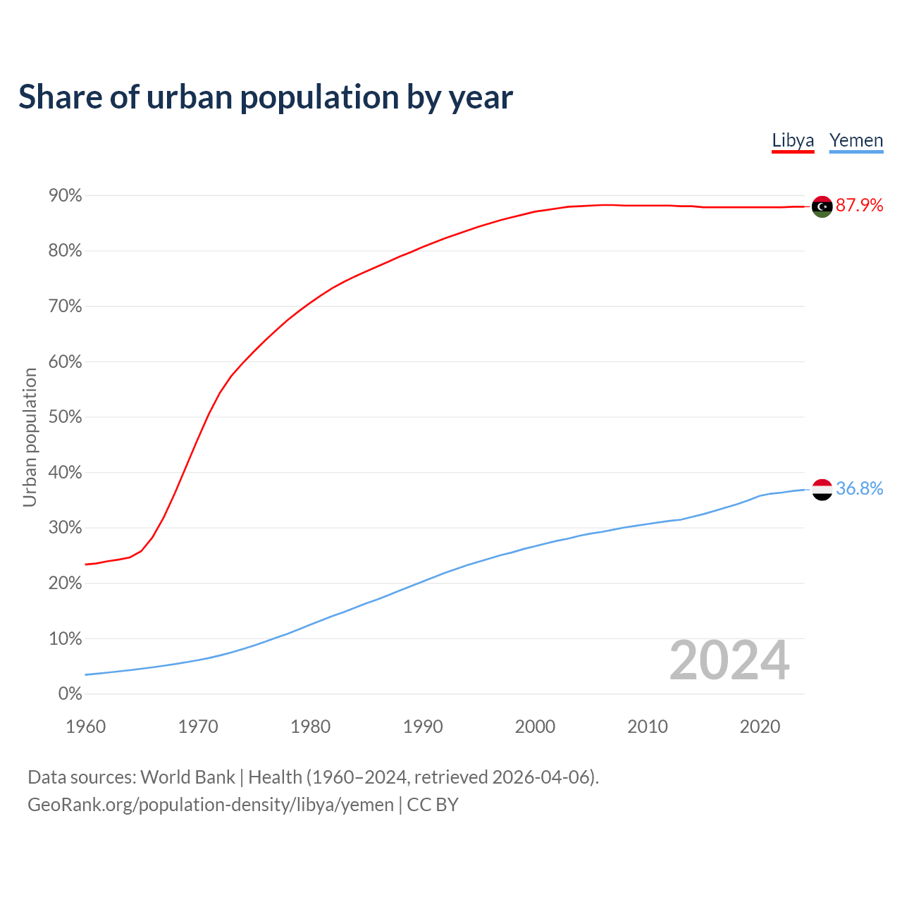 From 2004 to 2024, the share of urban population changed from 88% to 87.9% in Libya and from 28.5% to 36.8% in Yemen.