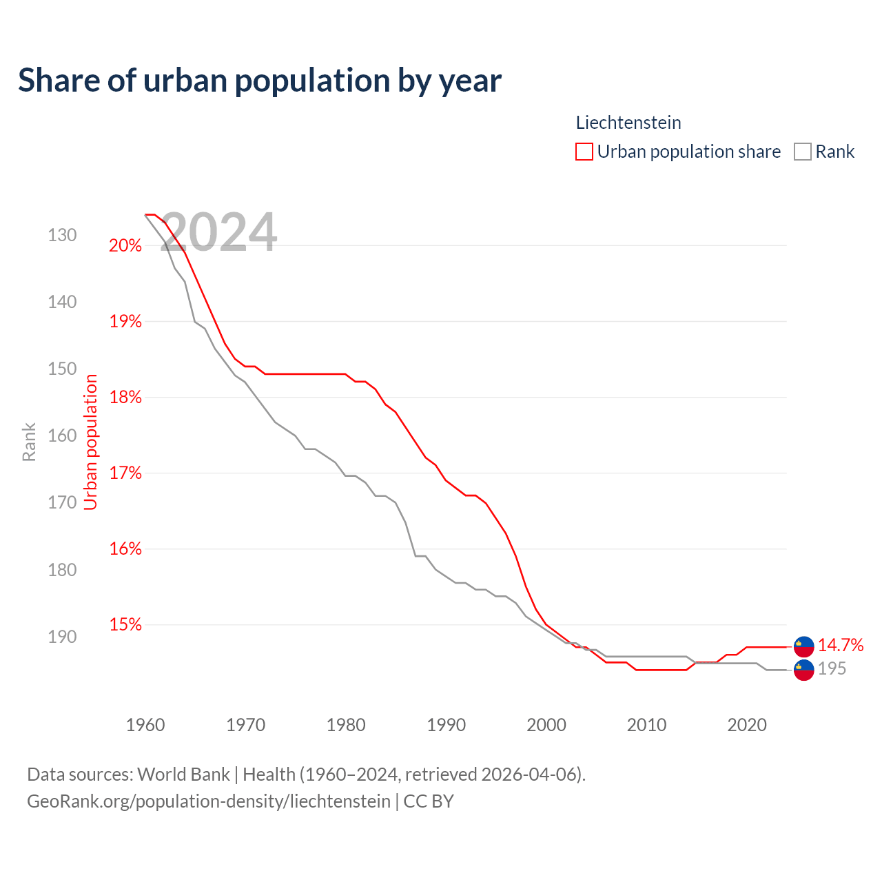 This chart shows the share of urban population in Liechtenstein from 1960 to 2024: 20.4% lived in urban areas in 1960, 15% in 2000, and 14.7% in 2024.