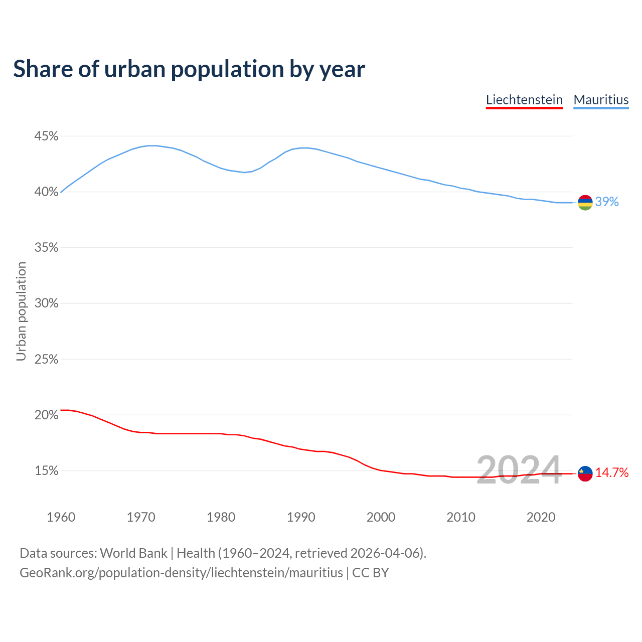 From 2004 to 2024, the share of urban population changed from 14.7% to 14.7% in Liechtenstein and from 41.3% to 39% in Mauritius.
