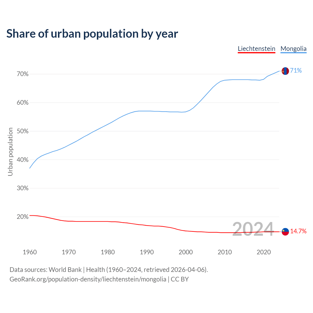 From 2004 to 2024, the share of urban population changed from 14.7% to 14.7% in Liechtenstein and from 60.8% to 71% in Mongolia.