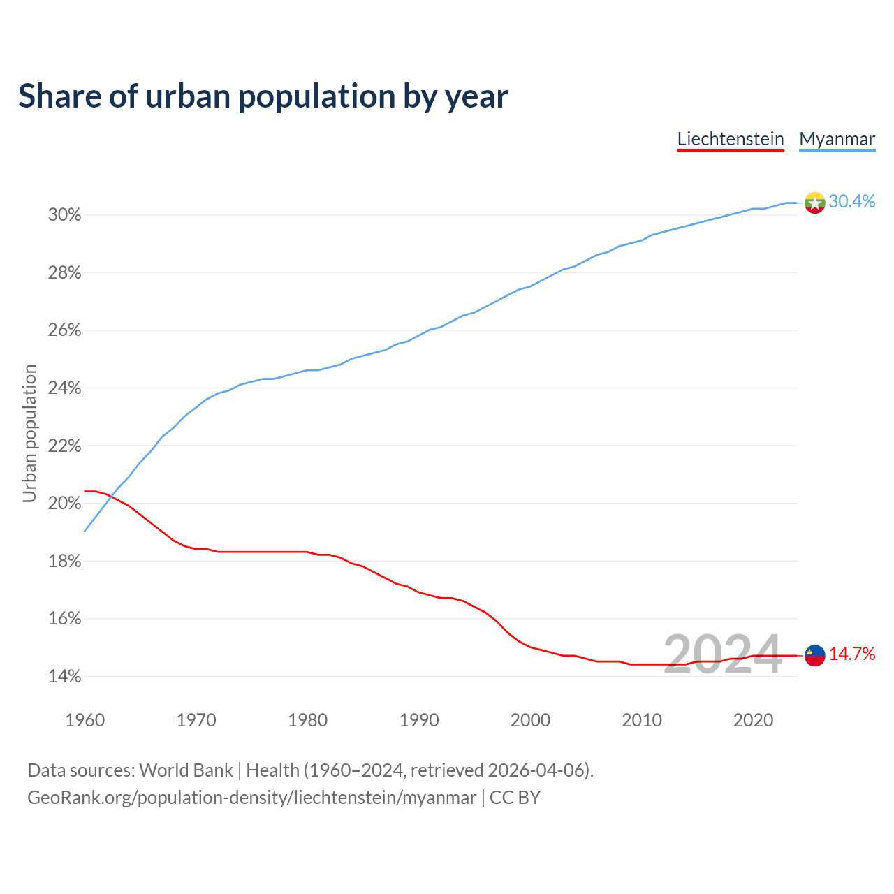 From 2004 to 2024, the share of urban population changed from 14.7% to 14.7% in Liechtenstein and from 28.2% to 30.4% in Myanmar.