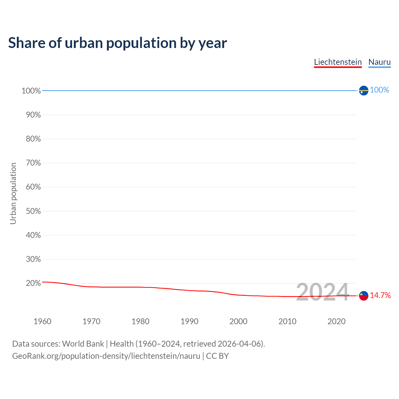 From 2004 to 2024, the share of urban population changed from 14.7% to 14.7% in Liechtenstein and from 100% to 100% in Nauru.
