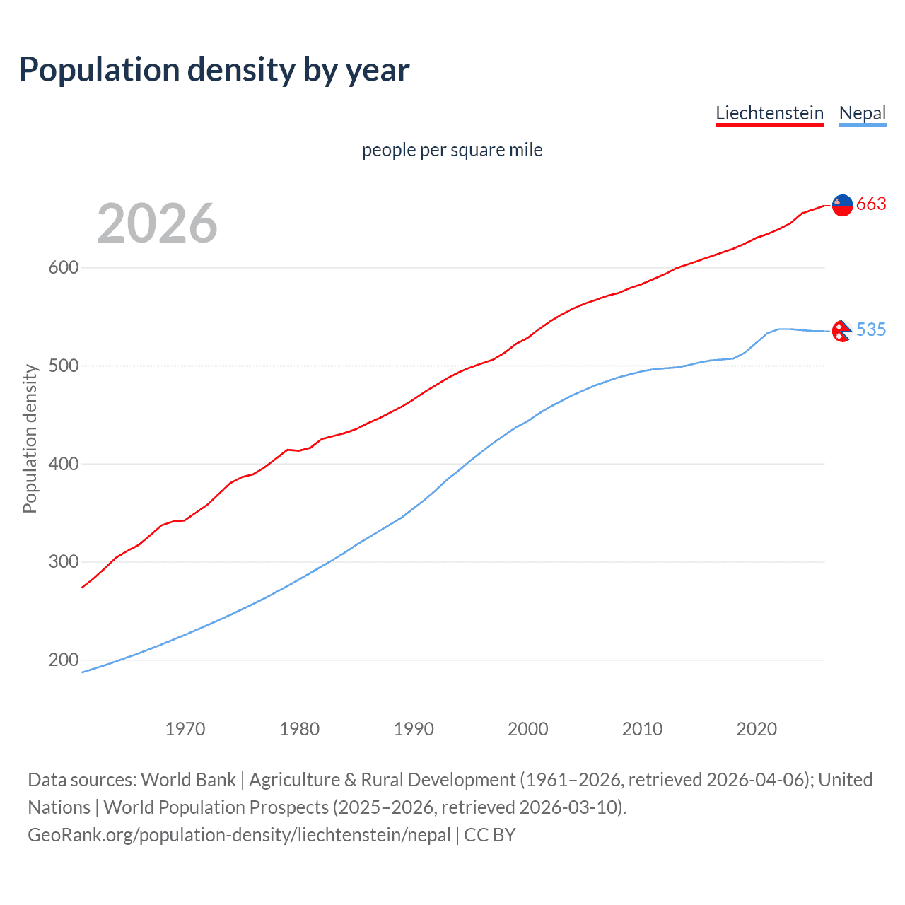 From 2006 to 2026, population density in Liechtenstein increased by 16.9%, compared to a 11.4% growth in Nepal.