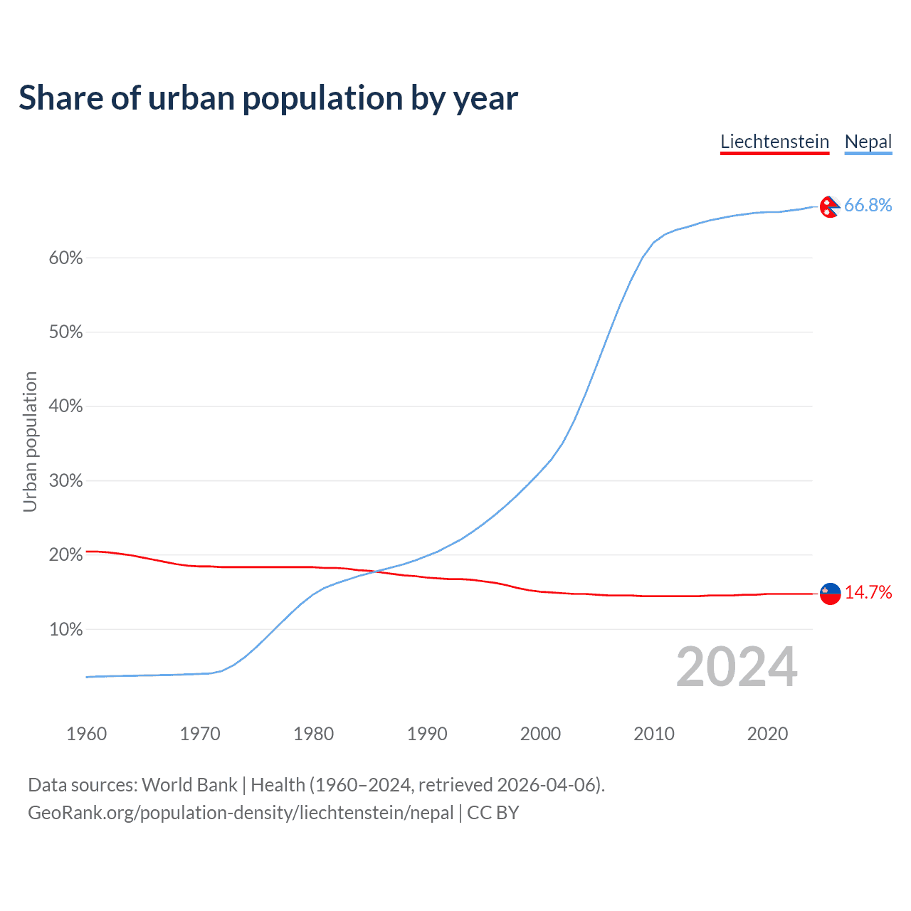 From 2004 to 2024, the share of urban population changed from 14.7% to 14.7% in Liechtenstein and from 41.6% to 66.8% in Nepal.