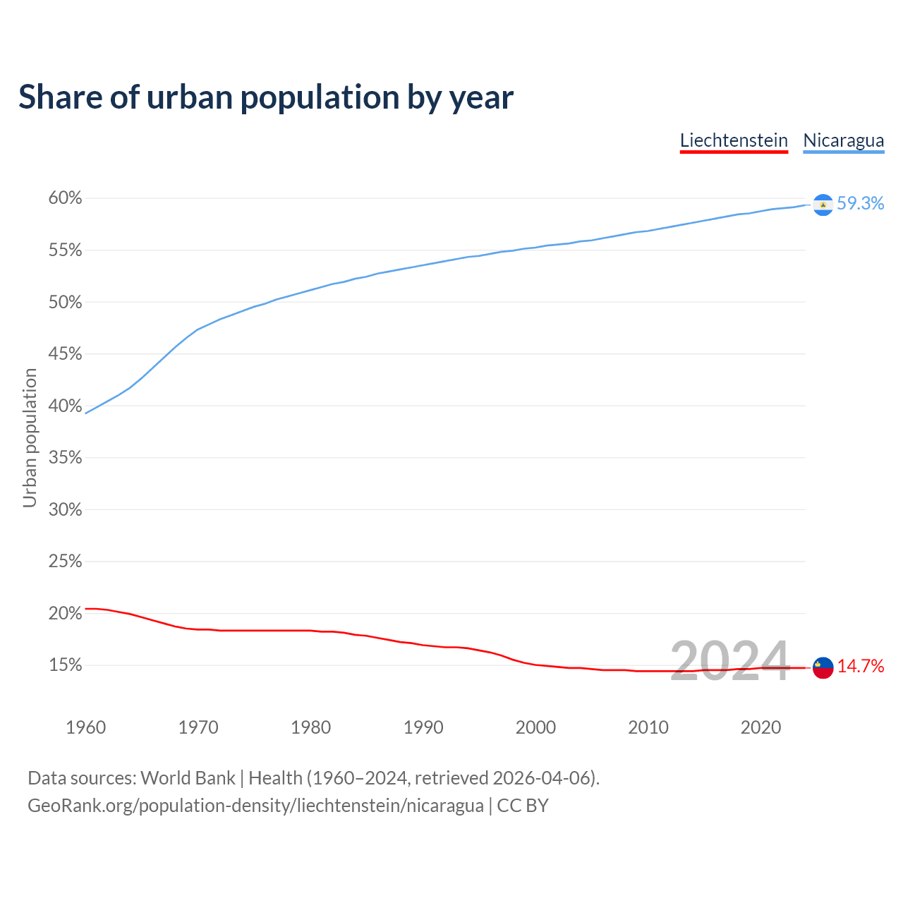 From 2004 to 2024, the share of urban population changed from 14.7% to 14.7% in Liechtenstein and from 55.8% to 59.3% in Nicaragua.