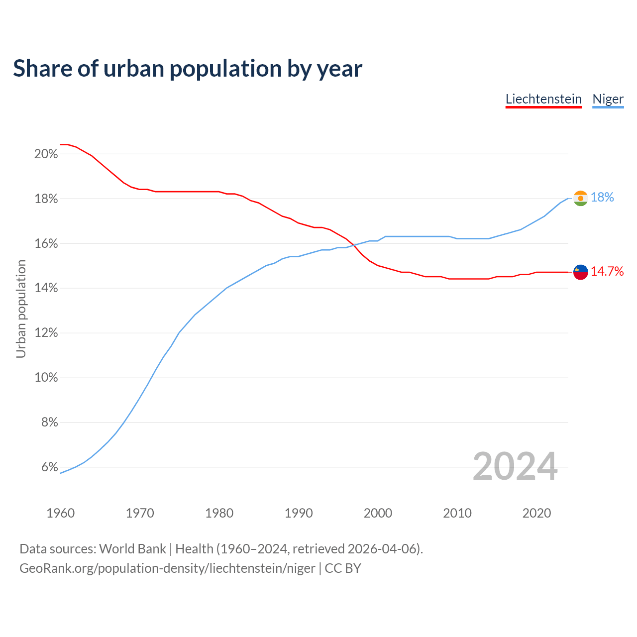 From 2004 to 2024, the share of urban population changed from 14.7% to 14.7% in Liechtenstein and from 16.3% to 18% in Niger.