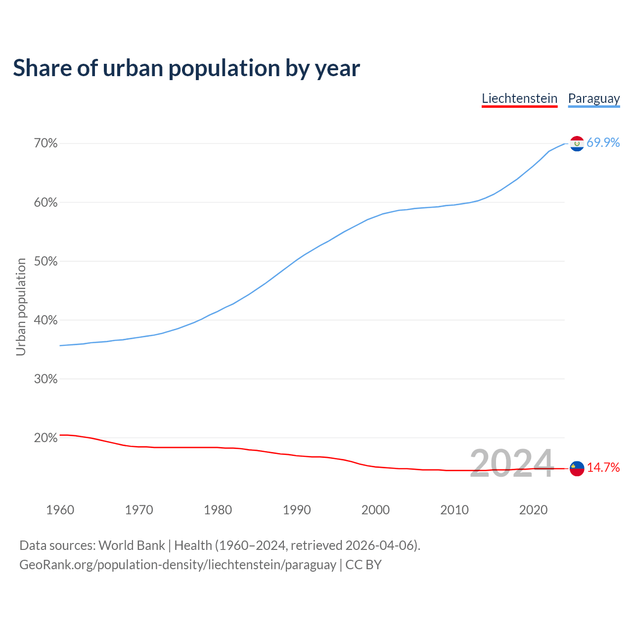 From 2004 to 2024, the share of urban population changed from 14.7% to 14.7% in Liechtenstein and from 58.7% to 69.9% in Paraguay.