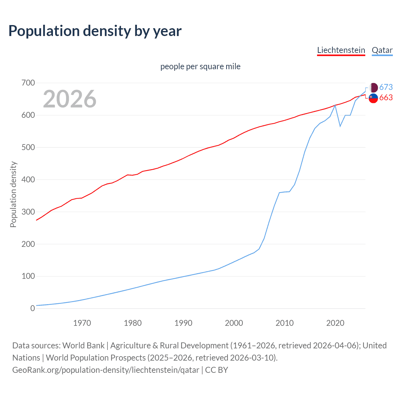 From 2006 to 2026, population density in Liechtenstein increased by 16.9%, compared to a 210.1% growth in Qatar.