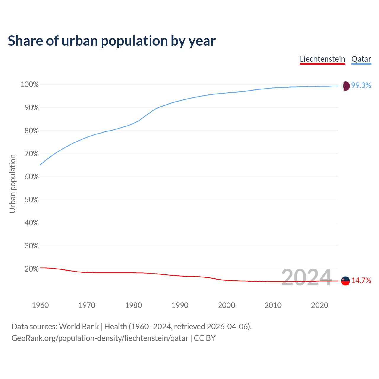 From 2004 to 2024, the share of urban population changed from 14.7% to 14.7% in Liechtenstein and from 97% to 99.3% in Qatar.