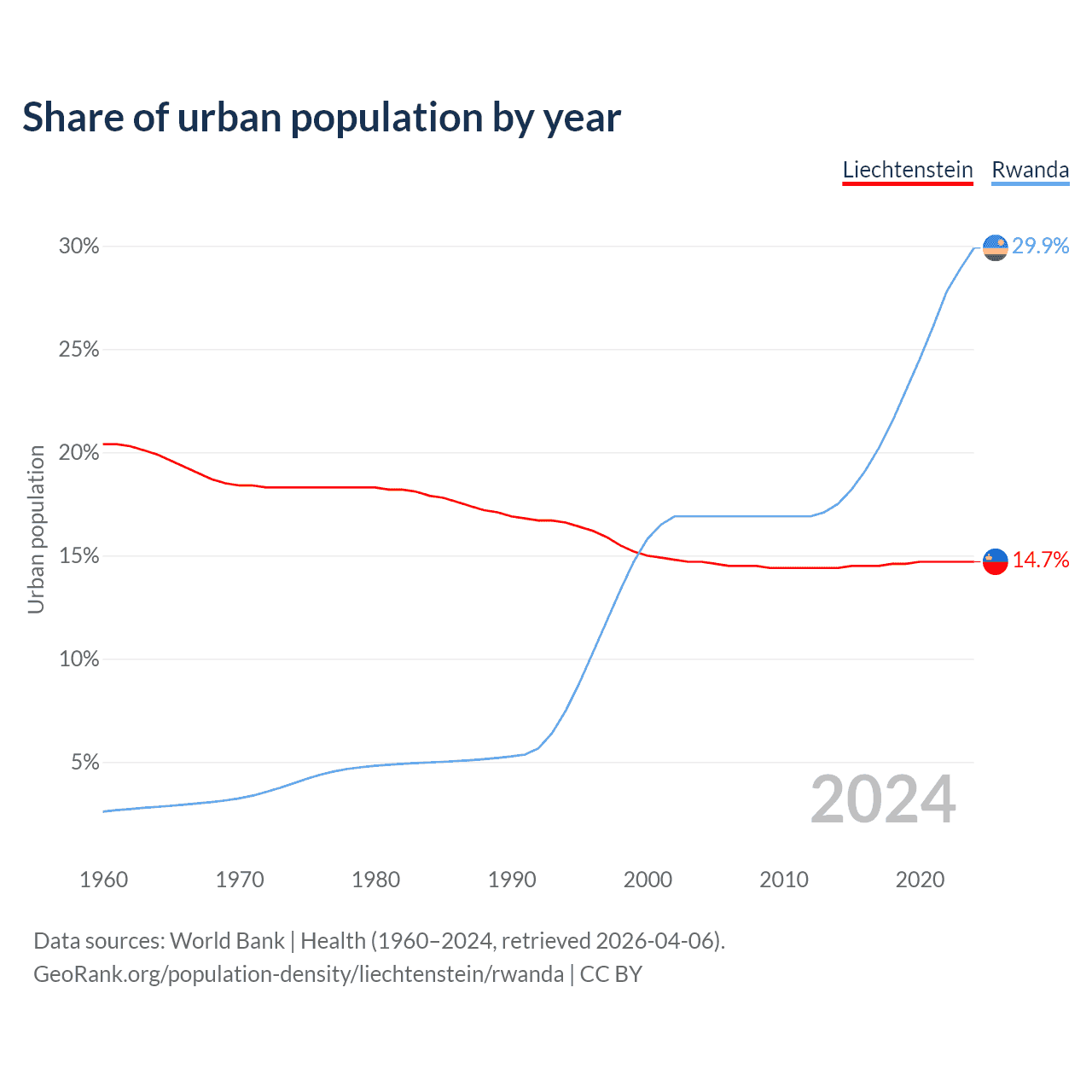 From 2004 to 2024, the share of urban population changed from 14.7% to 14.7% in Liechtenstein and from 16.9% to 29.9% in Rwanda.