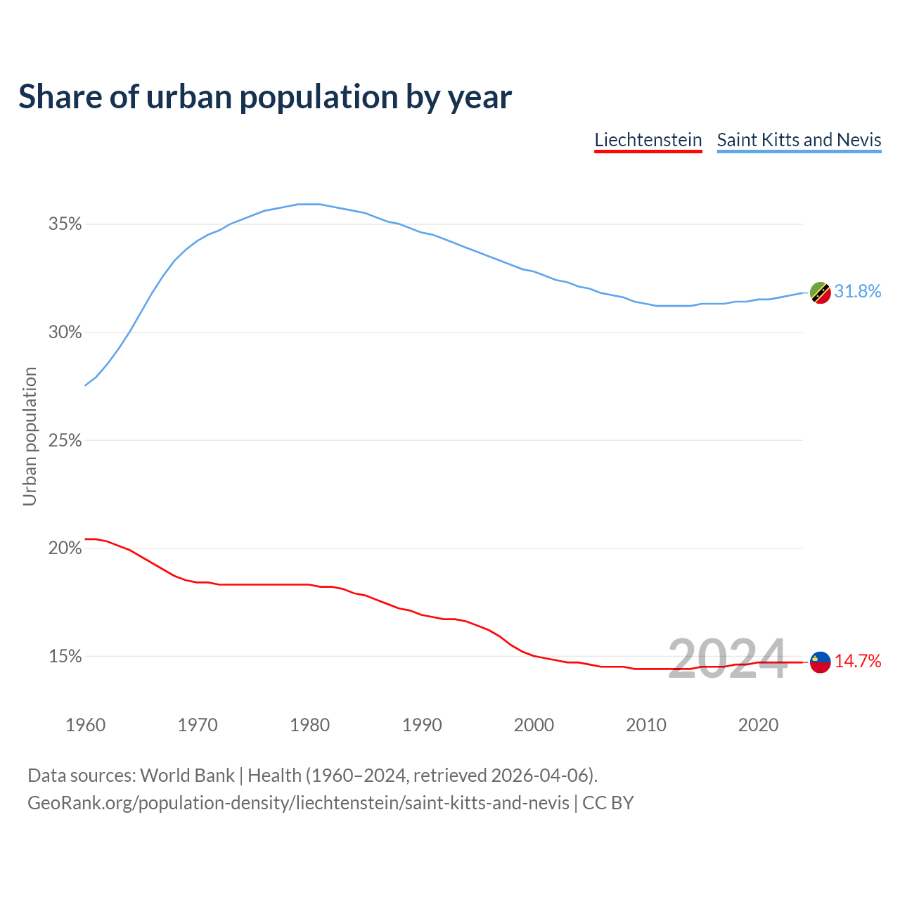 From 2004 to 2024, the share of urban population changed from 14.7% to 14.7% in Liechtenstein and from 32.1% to 31.8% in Saint Kitts and Nevis.