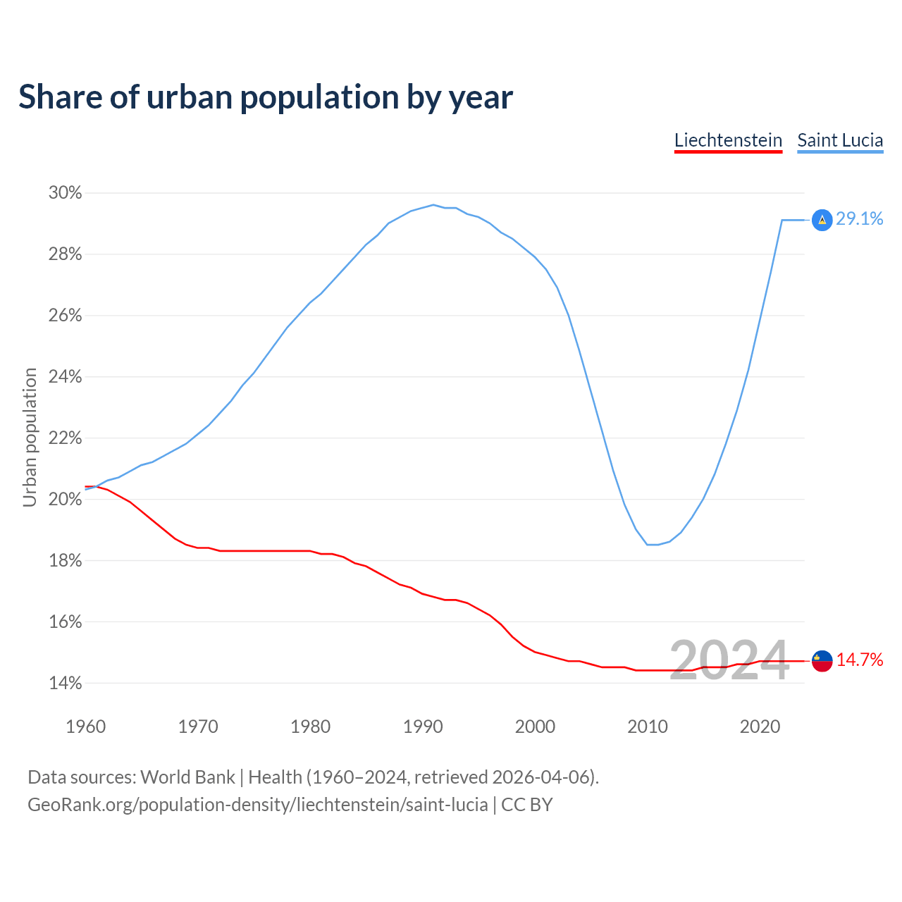 From 2004 to 2024, the share of urban population changed from 14.7% to 14.7% in Liechtenstein and from 24.8% to 29.1% in Saint Lucia.
