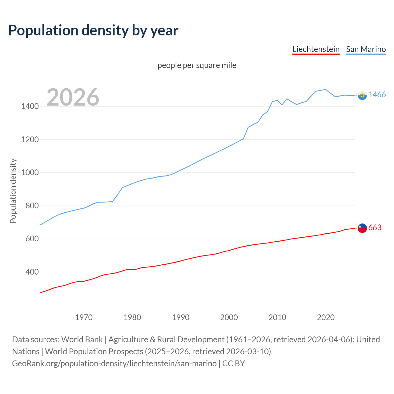 From 2006 to 2026, population density in Liechtenstein increased by 16.9%, compared to a 12.5% growth in San Marino.