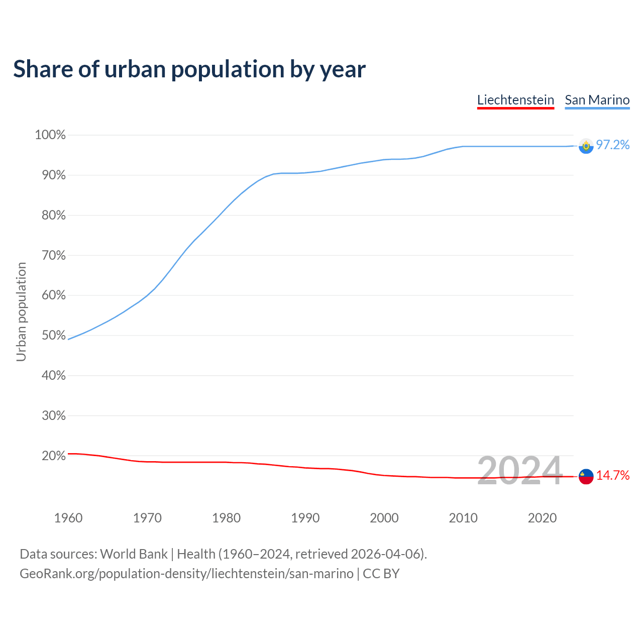 From 2004 to 2024, the share of urban population changed from 14.7% to 14.7% in Liechtenstein and from 94.2% to 97.2% in San Marino.