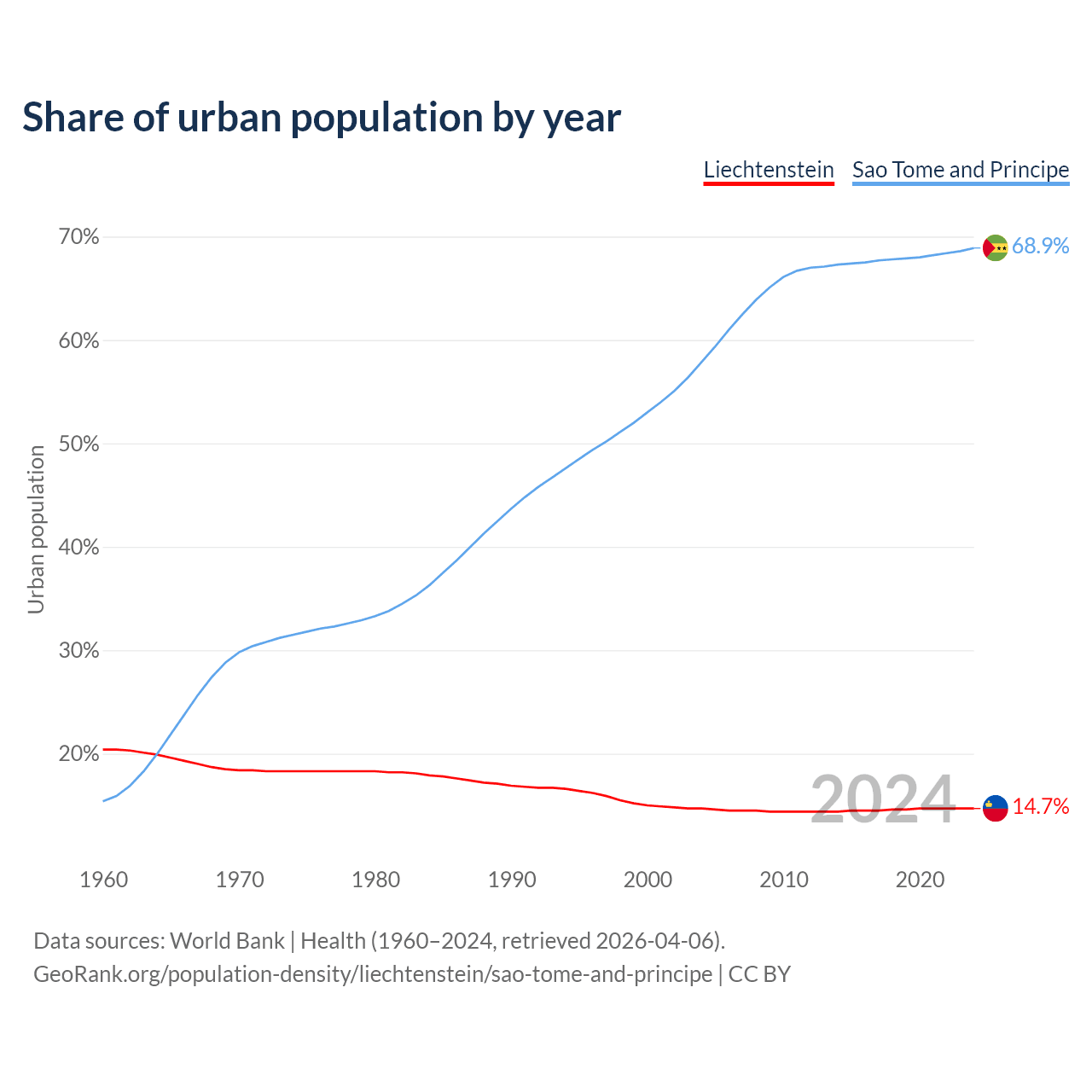 From 2004 to 2024, the share of urban population changed from 14.7% to 14.7% in Liechtenstein and from 57.9% to 68.9% in Sao Tome and Principe.