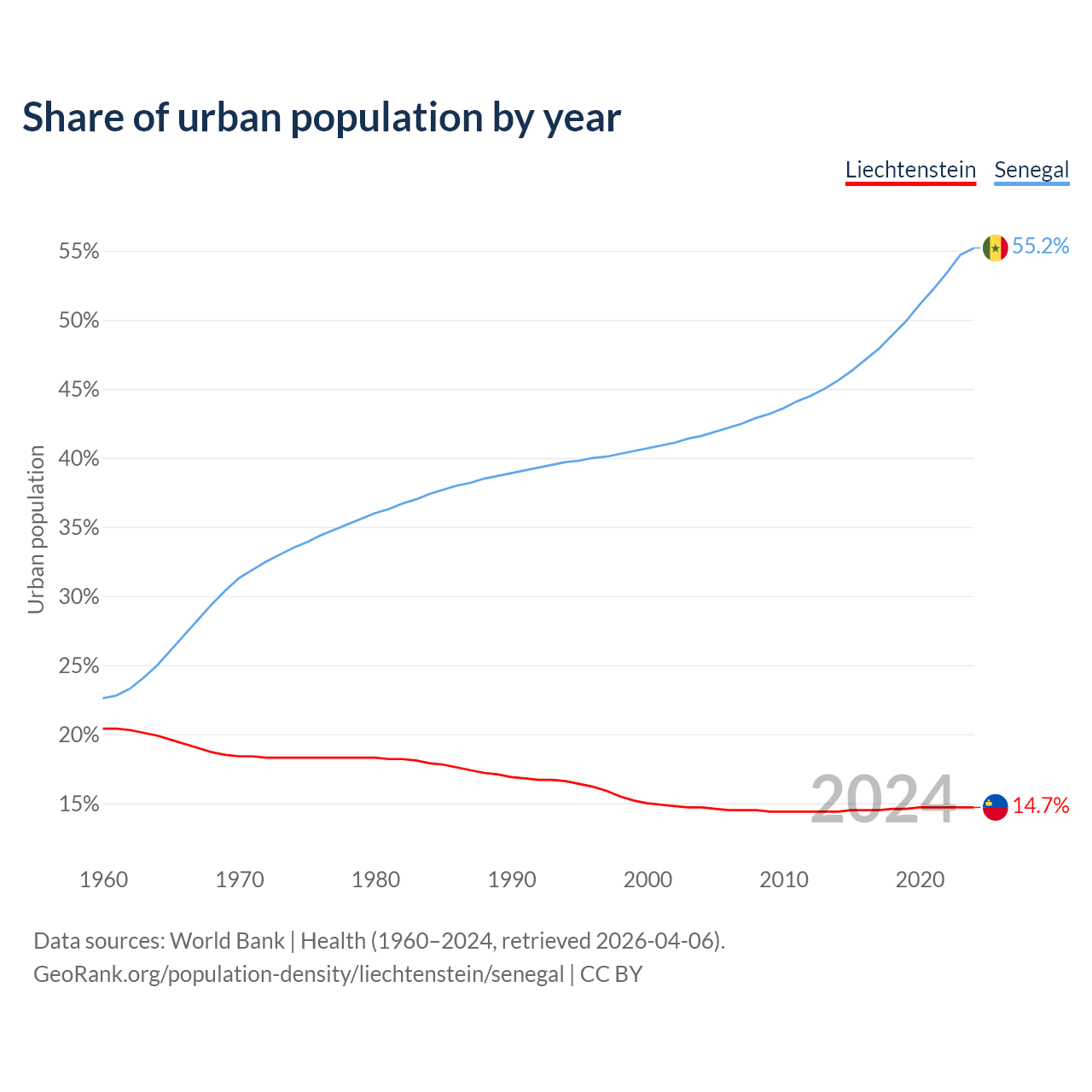 From 2004 to 2024, the share of urban population changed from 14.7% to 14.7% in Liechtenstein and from 41.6% to 55.2% in Senegal.