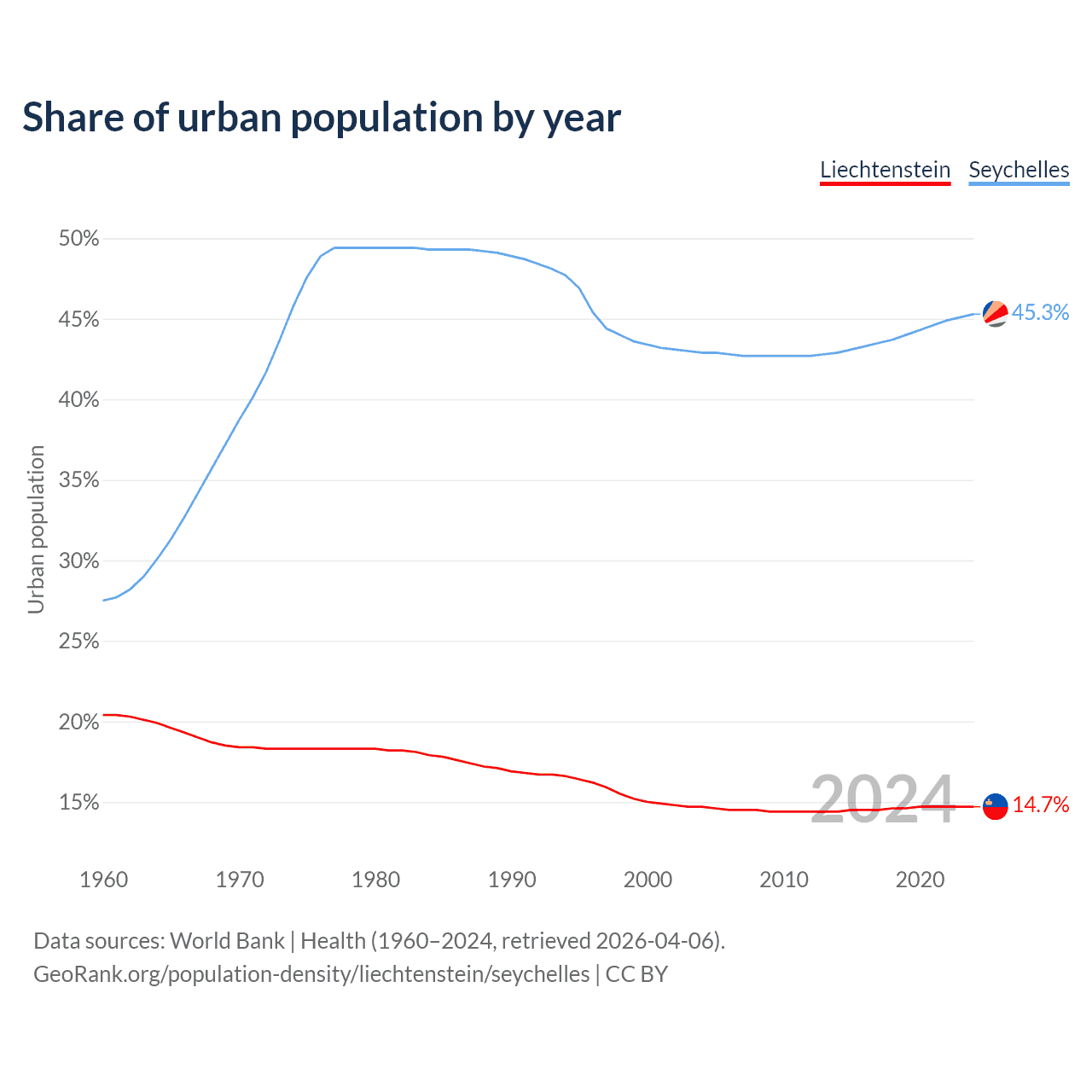 From 2004 to 2024, the share of urban population changed from 14.7% to 14.7% in Liechtenstein and from 42.9% to 45.3% in the Seychelles.