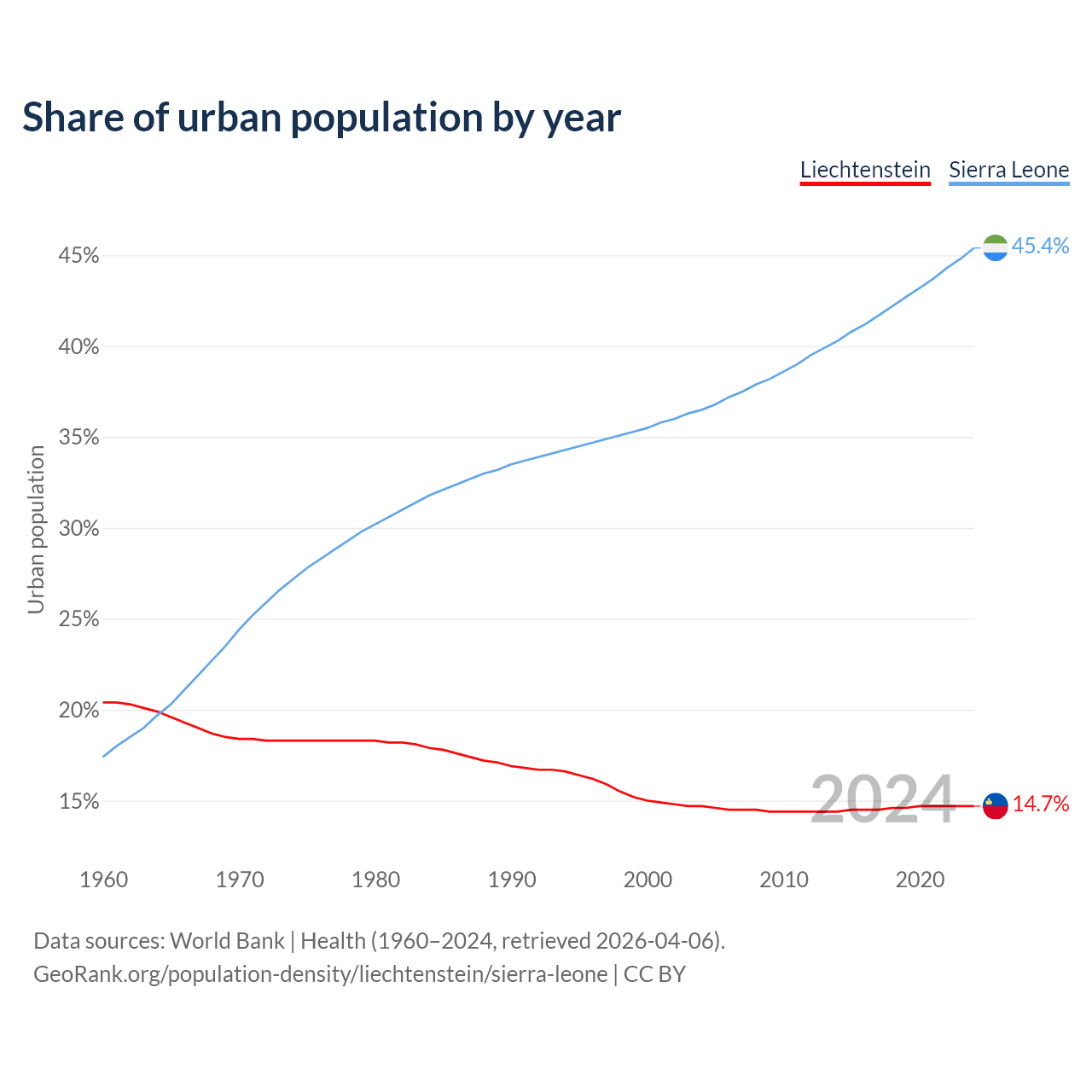 From 2004 to 2024, the share of urban population changed from 14.7% to 14.7% in Liechtenstein and from 36.5% to 45.4% in Sierra Leone.