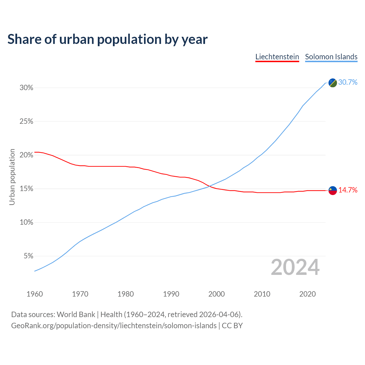 From 2004 to 2024, the share of urban population changed from 14.7% to 14.7% in Liechtenstein and from 17.2% to 30.7% in the Solomon Islands.