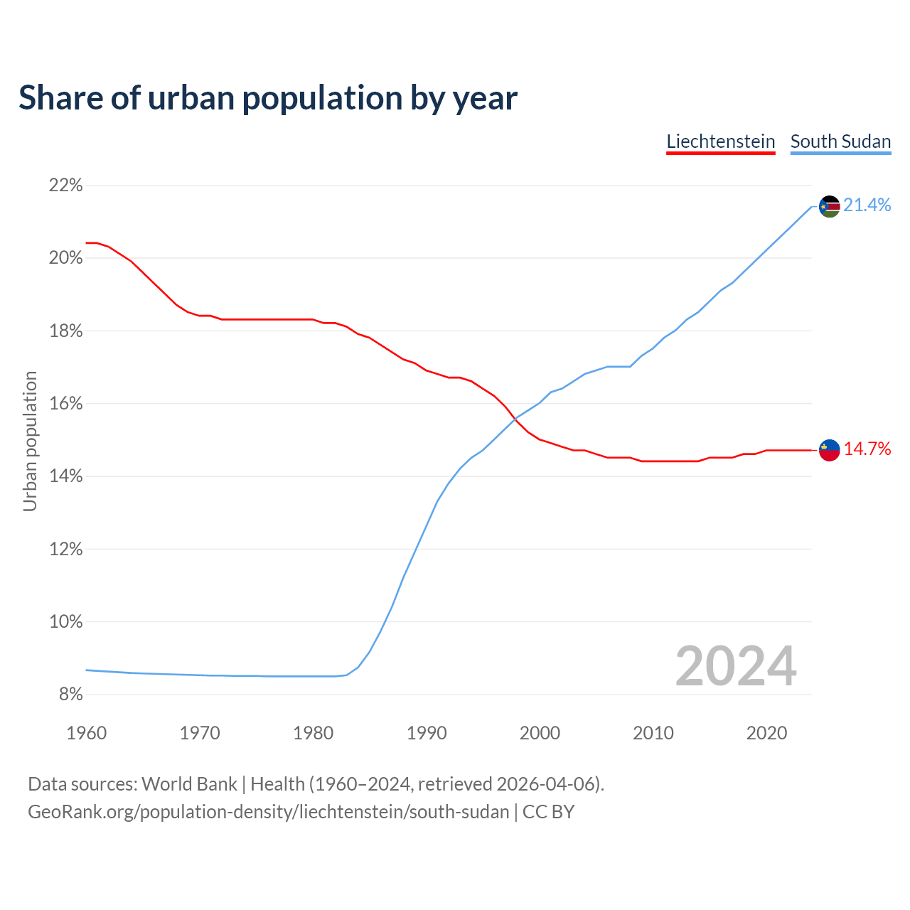 From 2004 to 2024, the share of urban population changed from 14.7% to 14.7% in Liechtenstein and from 16.8% to 21.4% in South Sudan.