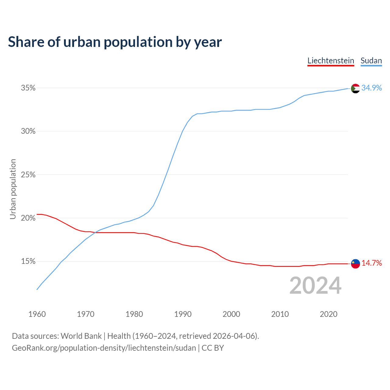 From 2004 to 2024, the share of urban population changed from 14.7% to 14.7% in Liechtenstein and from 32.4% to 34.9% in Sudan.