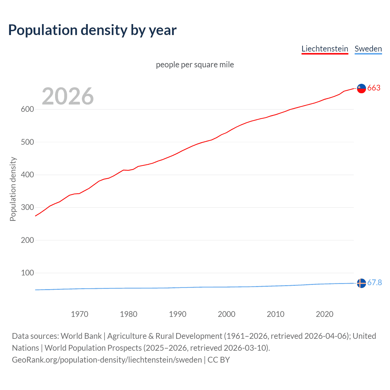 From 2006 to 2026, population density in Liechtenstein increased by 16.9%, compared to a 17.5% growth in Sweden.