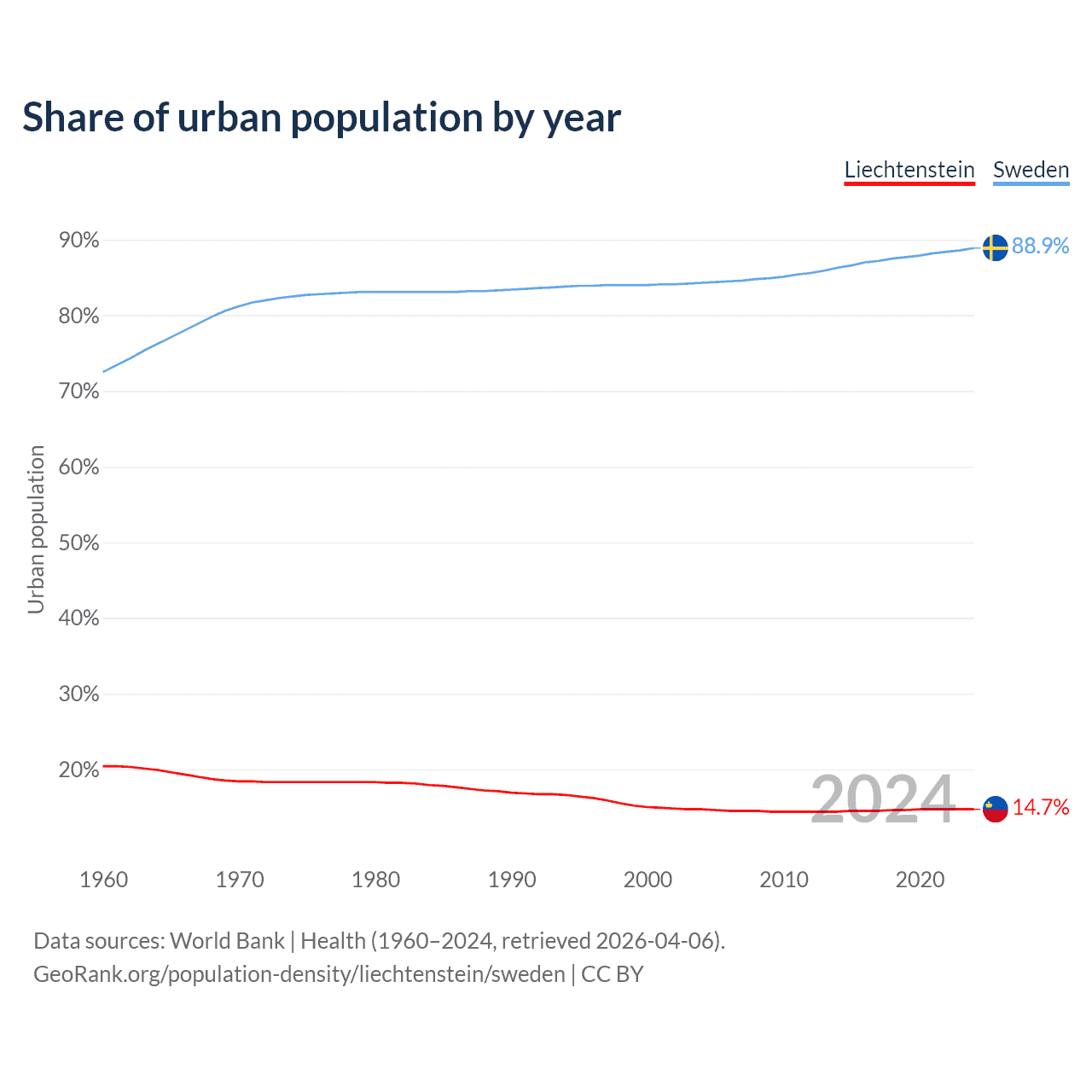From 2004 to 2024, the share of urban population changed from 14.7% to 14.7% in Liechtenstein and from 84.3% to 88.9% in Sweden.