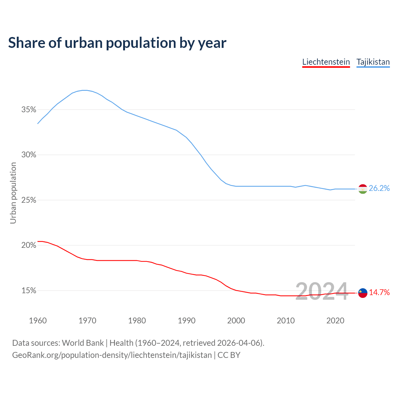 From 2004 to 2024, the share of urban population changed from 14.7% to 14.7% in Liechtenstein and from 26.5% to 26.2% in Tajikistan.