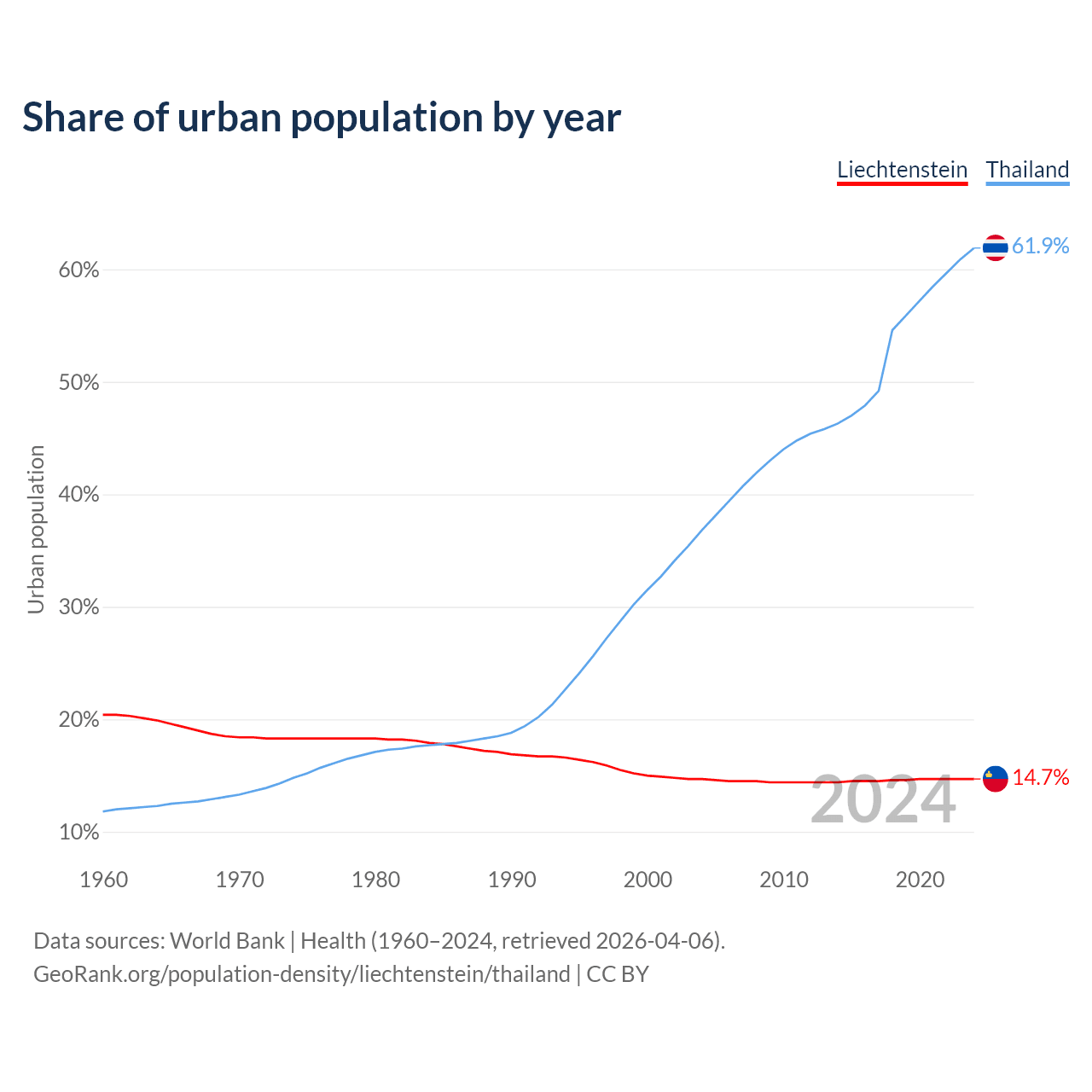 From 2004 to 2024, the share of urban population changed from 14.7% to 14.7% in Liechtenstein and from 36.8% to 61.9% in Thailand.
