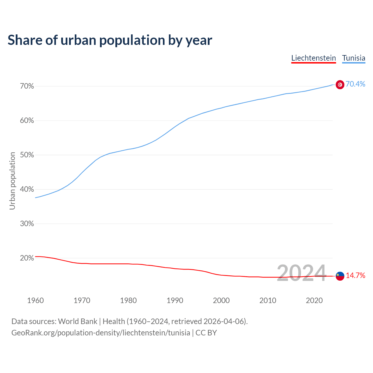 From 2004 to 2024, the share of urban population changed from 14.7% to 14.7% in Liechtenstein and from 64.9% to 70.4% in Tunisia.