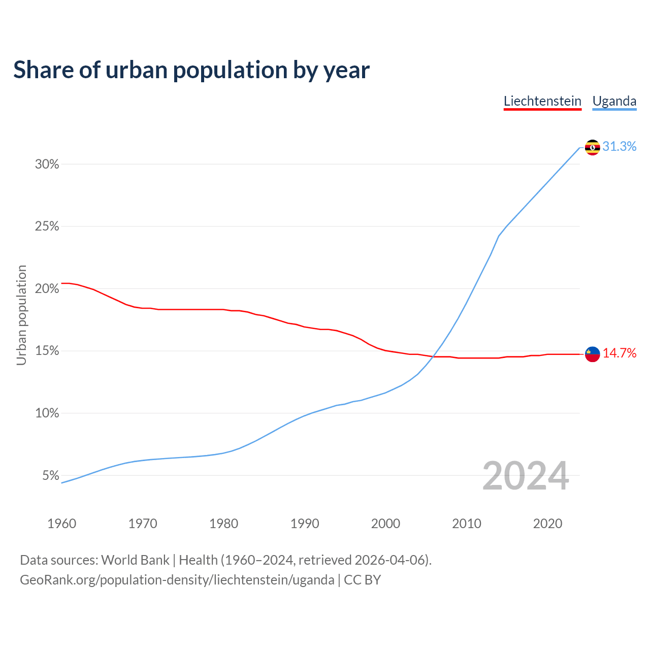 From 2004 to 2024, the share of urban population changed from 14.7% to 14.7% in Liechtenstein and from 13.1% to 31.3% in Uganda.