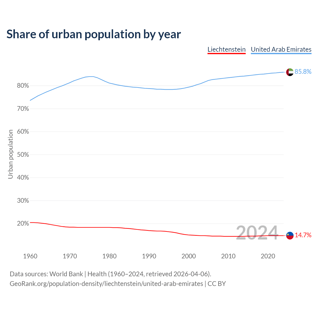From 2004 to 2024, the share of urban population changed from 14.7% to 14.7% in Liechtenstein and from 81.5% to 85.8% in the United Arab Emirates.
