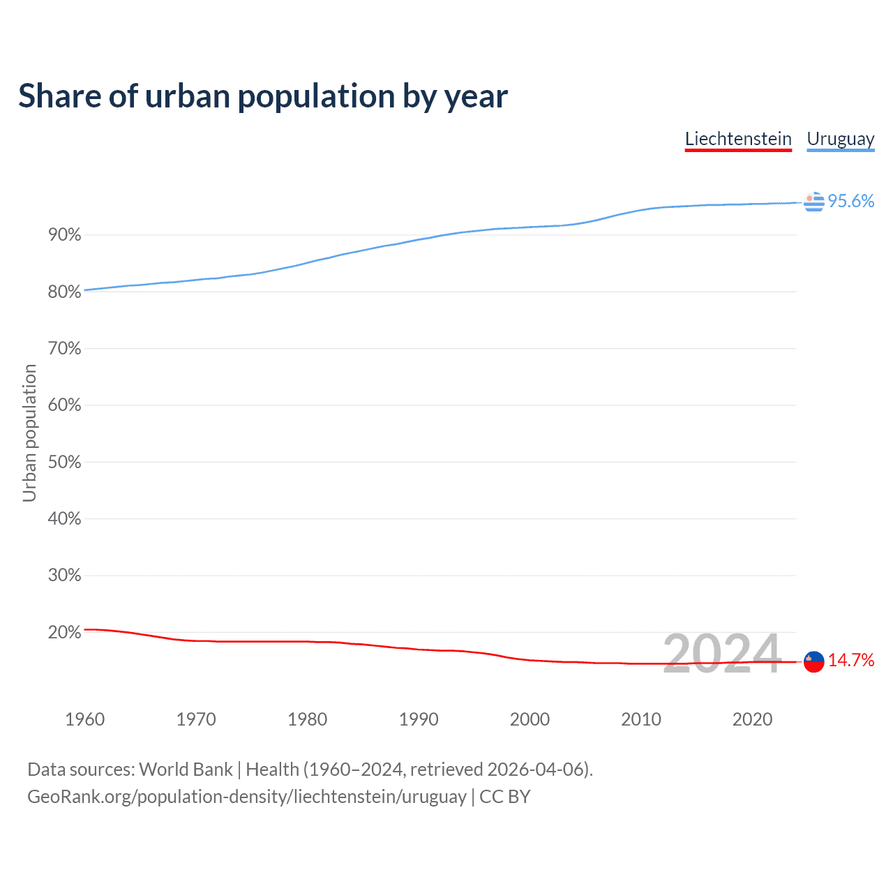 From 2004 to 2024, the share of urban population changed from 14.7% to 14.7% in Liechtenstein and from 91.8% to 95.6% in Uruguay.