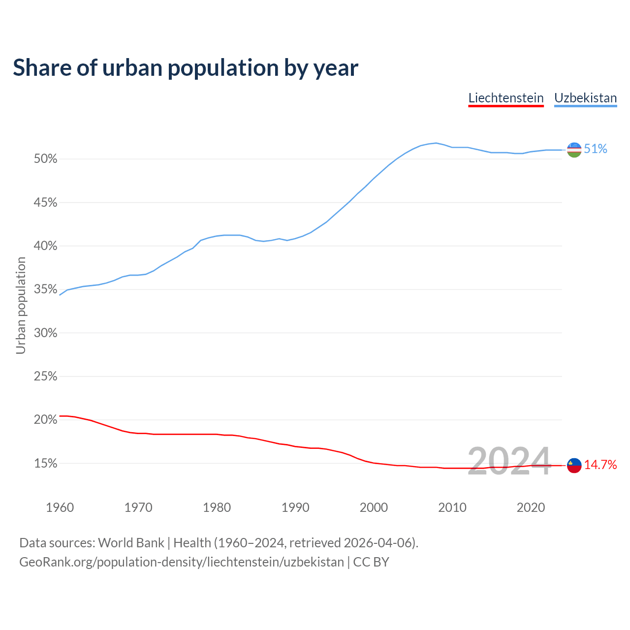 From 2004 to 2024, the share of urban population changed from 14.7% to 14.7% in Liechtenstein and from 50.6% to 51% in Uzbekistan.