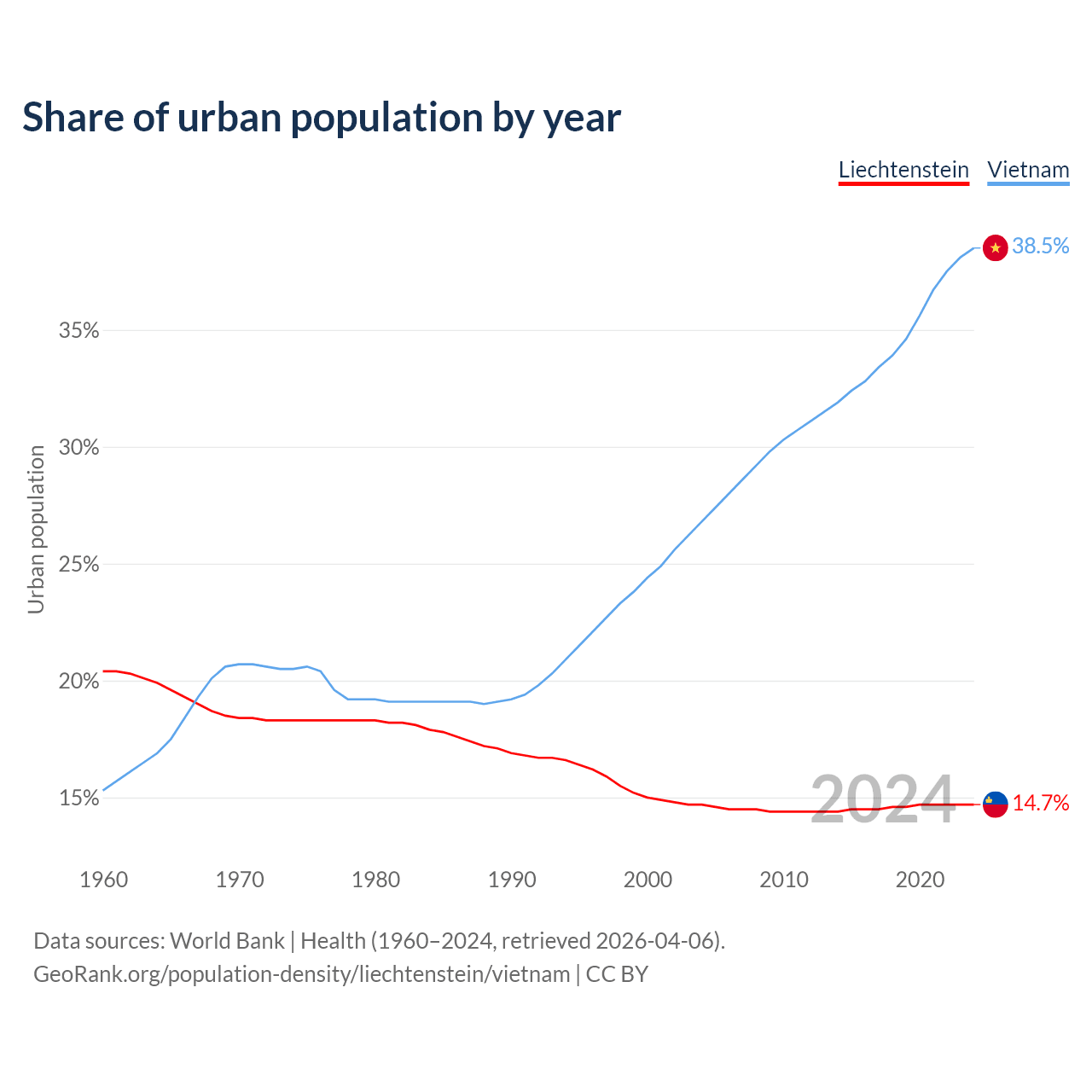 From 2004 to 2024, the share of urban population changed from 14.7% to 14.7% in Liechtenstein and from 26.8% to 38.5% in Vietnam.