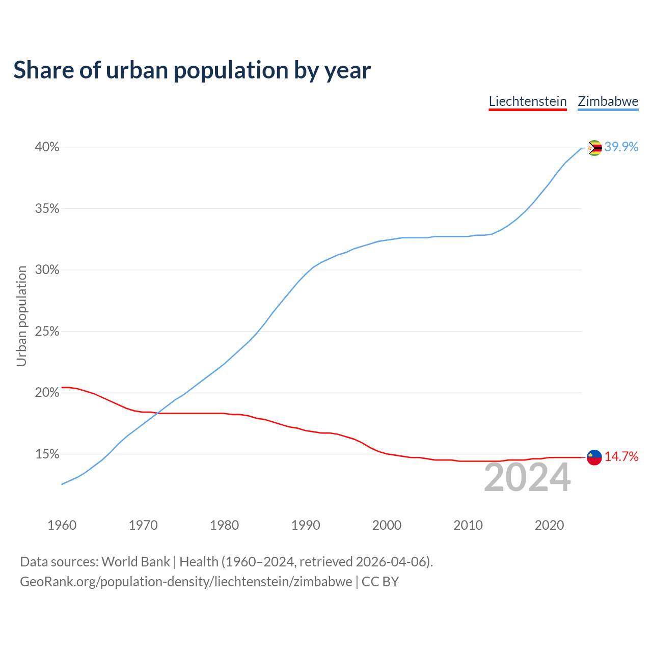 From 2004 to 2024, the share of urban population changed from 14.7% to 14.7% in Liechtenstein and from 32.6% to 39.9% in Zimbabwe.