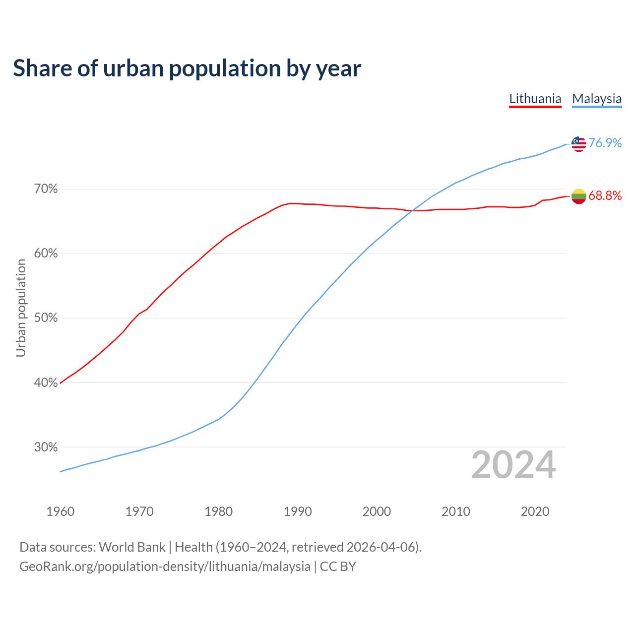 From 2004 to 2024, the share of urban population changed from 66.6% to 68.8% in Lithuania and from 66.1% to 76.9% in Malaysia.