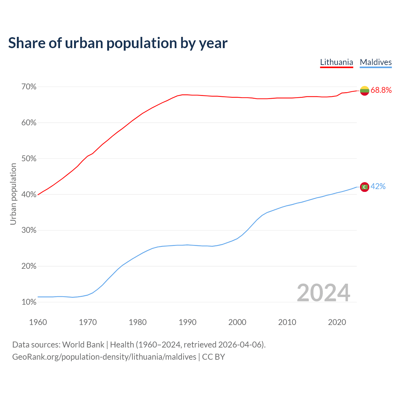 From 2004 to 2024, the share of urban population changed from 66.6% to 68.8% in Lithuania and from 32.9% to 42% in Maldives.